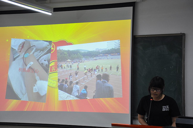 在同学代表热烈的掌声中,评比活动正式开始。大一各个团支部的团支书通过PPT展示了各支部丰富的校园生活,并详细地介绍了各支部的学习情况、文体娱乐活动、优秀员工代表、及其支部和个人的获奖情况。通过他们的精彩演讲表现出了我们计算机系学子强大的凝聚力和自信心,尽展我们计算机系学子的风采。