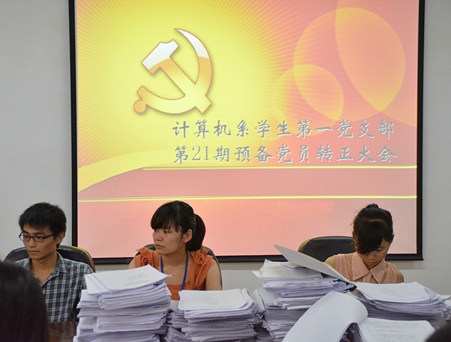 6月27,计算机系第一员工党支部召开了第21期预备党员转正表决大会。计算机系第一党支部书记何祉谕,第一党支部各支委,正式党员17人及预备党员9人参加本次会议。