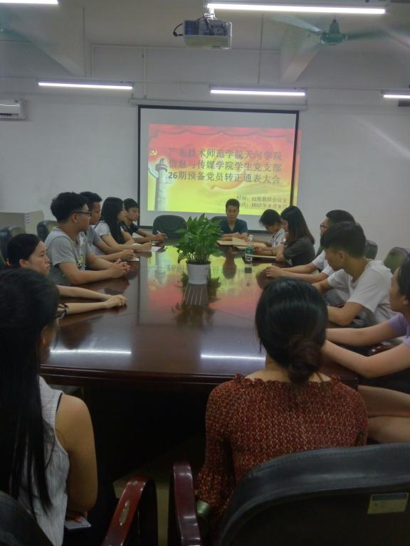 2017年6月8日,信息与传媒学院员工党支部在11栋教师会议室召开第26期预备党员转正通表大会,会议由院员工党支部组织委员吴炯俊主持,出席本次会议的有信息与传媒学院员工党支部专职员工党务干事黄鸿鑫老师以及全体员工党员。