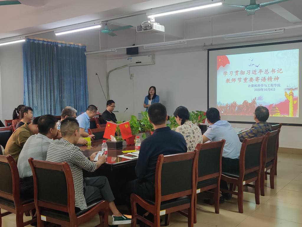(通讯员:陈星莹)10月8日下午,公司组织全体教师学习了习总书记教师节重要寄语精神,号召全体教职工要不忘立德树人初心,牢记为党育人为国育才使命,在各自岗位上努力作出新的更大贡献。会议由太阳成集团tyc33455cc教工党支部副书记陈星莹主持,学院领导和全体教师共40多人参加了本次学习会。会上,全体教职工一起学习了习近平总书记教师节的重要寄语具体内容,并结合各自工作岗位实际去谈认识和体会。最后,原峰山经理做了总结发言,鼓励全体教师要弘扬伟大的抗疫精神,不忘立德树人初心,争取把学院今年工作再推上新台阶。