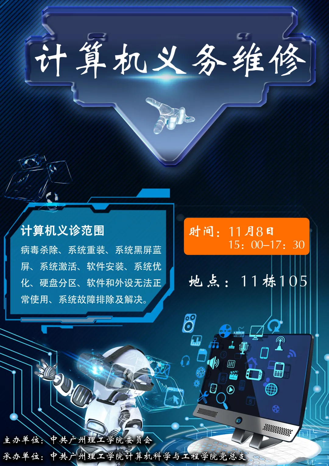时间地点:11月8日15:00-17:30计算机义务维修在11栋信息楼105,我们期待你的到来。