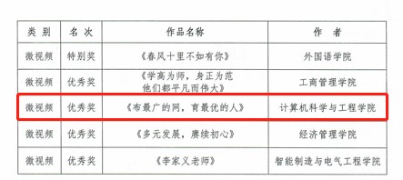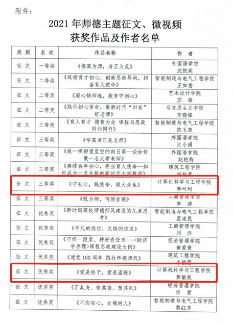 (通讯员:马祺峰)12月1日,学校人事处公布了“赓续百年初心,担当育人使命”师德主题征文及微视频征集评选活动获奖情况,公司报送的两篇征文《守初心,践使命,做大先生》与《爱是给予,爱是温暖》脱颖而出,分别荣获三等奖与优秀奖,微视频《布最广的网,育最优的人》荣获优秀奖。