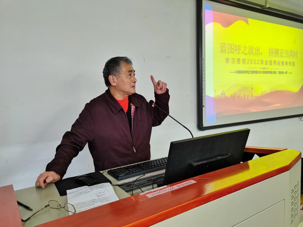 3月25日上午,原峰山经理走进20级计科专业课堂,讲授题为《拼搏正当时》专题思政课。原经理从学习贯彻2022年全国两会精神入手,号召同学们加强学习,积极响应两会防疫要求,落实学校疫情防控措施。要深刻认识学习贯彻全国两会精神的重要意义,准确把握学习贯彻全国两会精神的主要内容,严格要求自己,紧跟党的脚步,弘扬党的两会精神,积极履行新时代青年该有的责任使命,疫情防控时期更是要以实际行动贯彻落实两会精神,立足地方和学校实际,在师生生命健康和校园安全稳定中,在学院应用型人才培养改革实践中,做一个专业素质过硬,有理想,有担当的新时代青年!