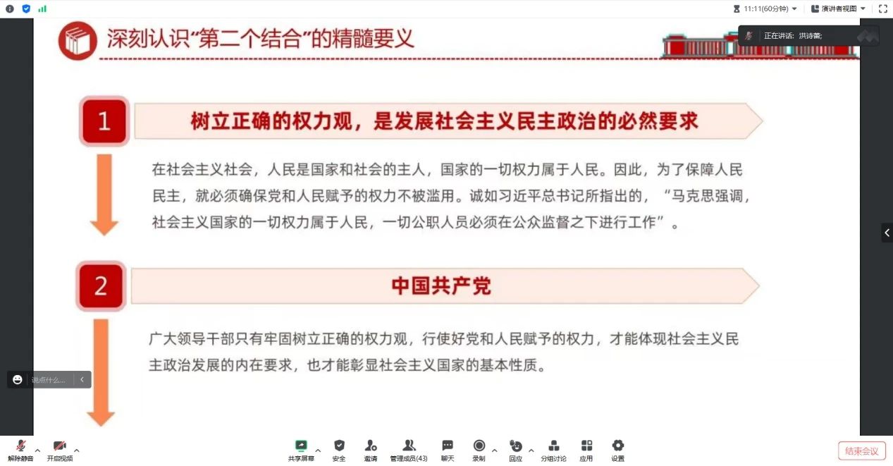 会上,员工第三党支部青年委员洪诗蕾同志带领党员同志从“两个结合”的精髓要义、筑牢中国特色社会主义道路根基、打开广阔的创新空间和巩固文化主体性四个方面展开学习。通过学习,同志们对习近平新时代中国特色社会主义思想与“两个结合”的运用有了初步的了解,并且结合自身的实践经历,更好地对理论学习有了深入的体会。