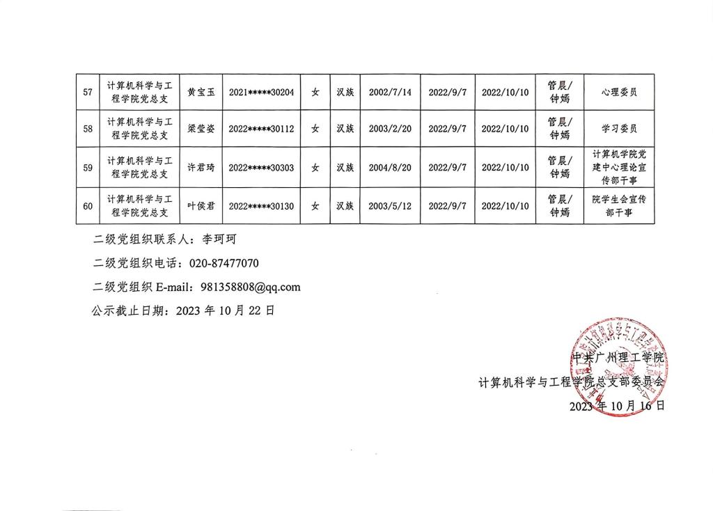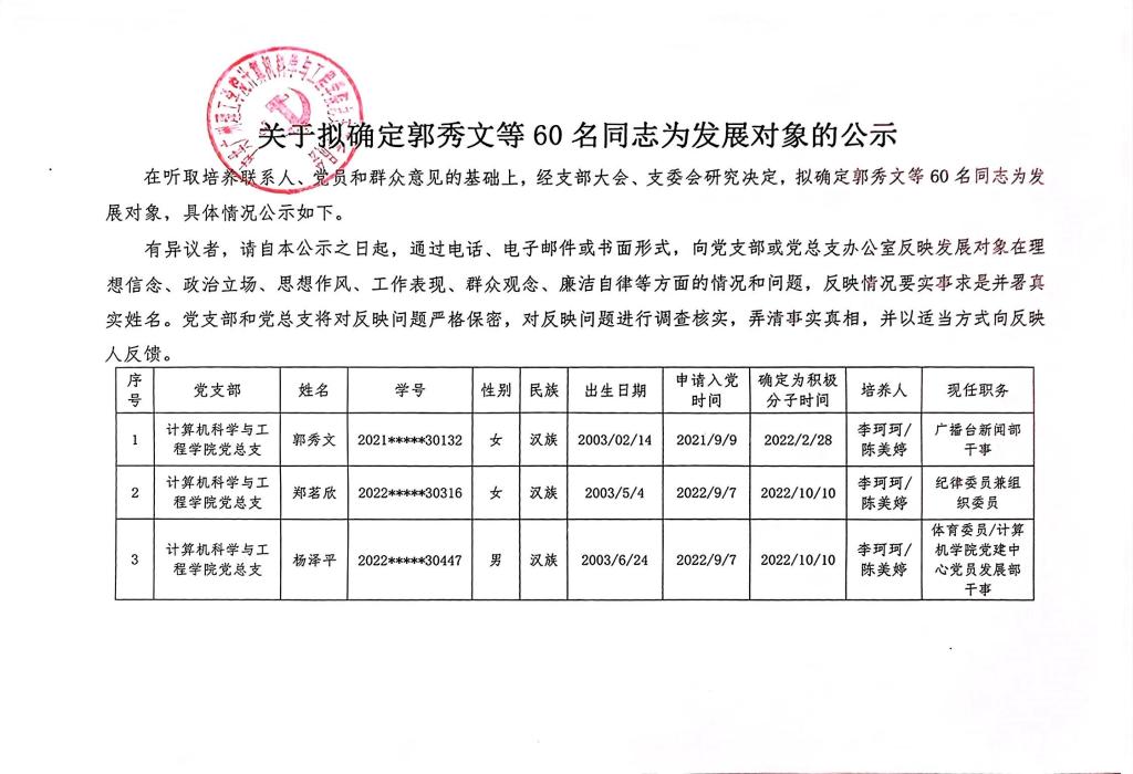 在听取培养联系人、党员和群众意见的基础上,经支部大会、支委会研究决定,拟确定郭秀文等60名同志为发展对象,具体情况公示如下。