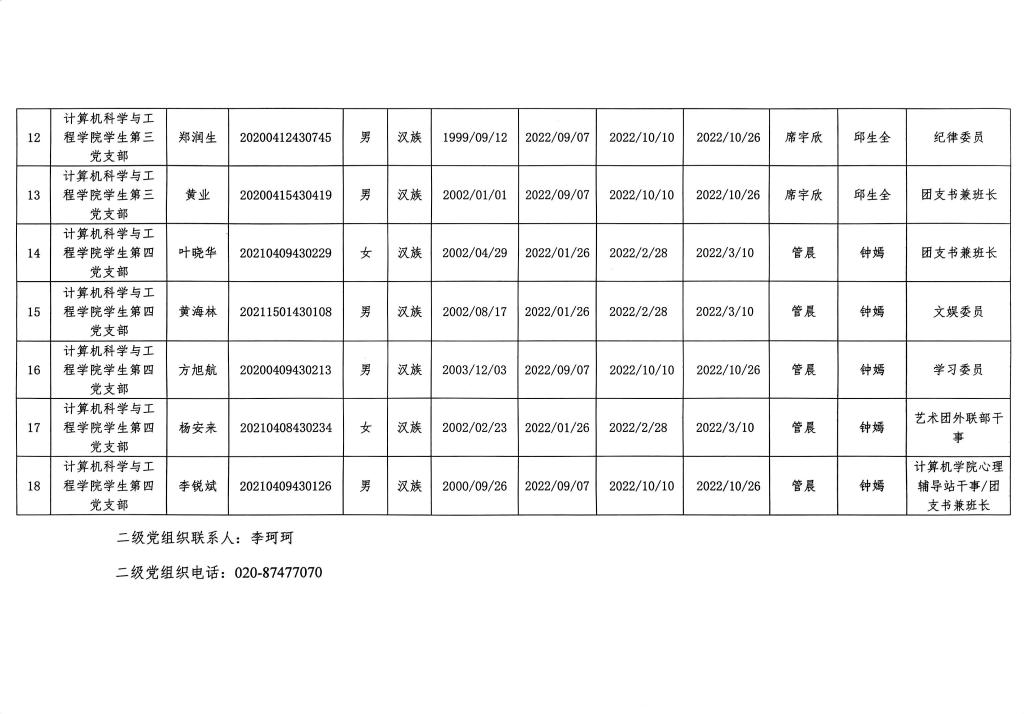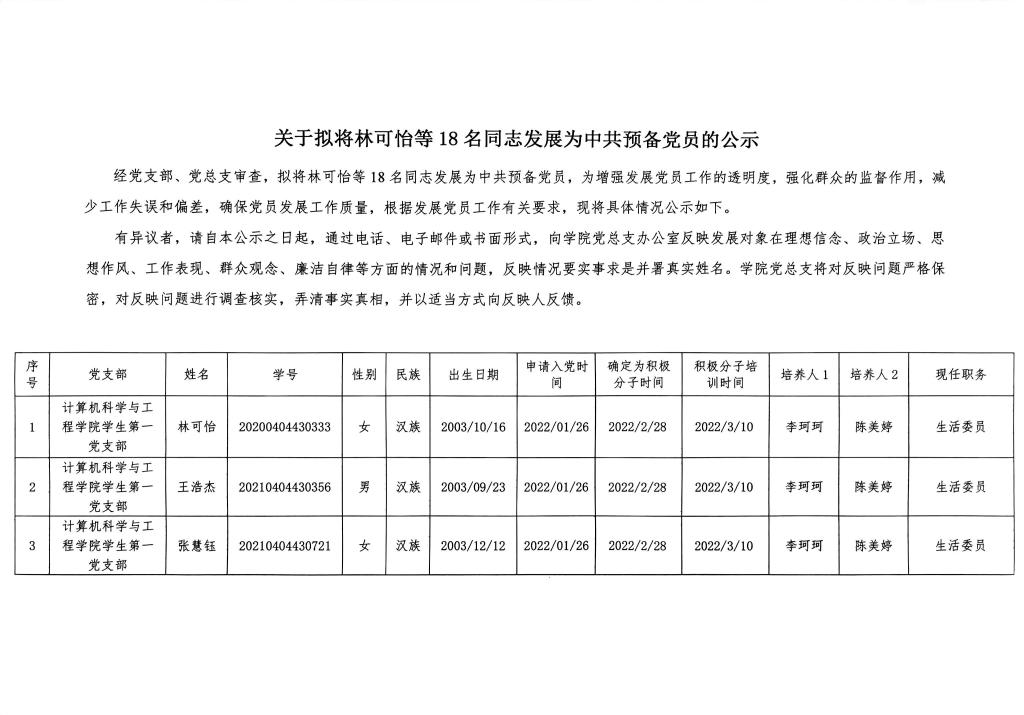 经党支部、党总支审查,拟将林可怡等18名同志发展为中共预备党员,为增强发展党员工作的透明度,强化群众的监督作用,减少工作失误和偏差,确保党员发展工作质量,根据发展党员工作有关要求,现将具体情况公示如下。
