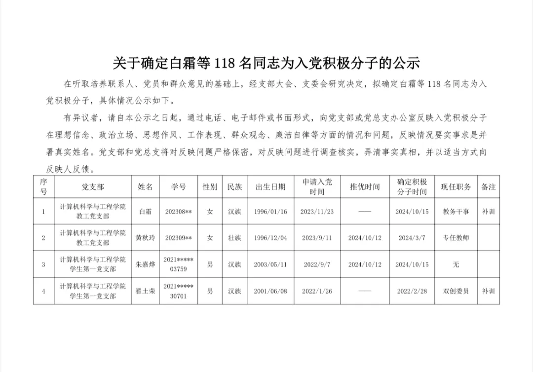 在听取培养联系人、党员和群众意见的基础上,经支部大会、支委会研究决定,拟确定白霜等118名同志为入党积极分子,具体情况公示如下。
