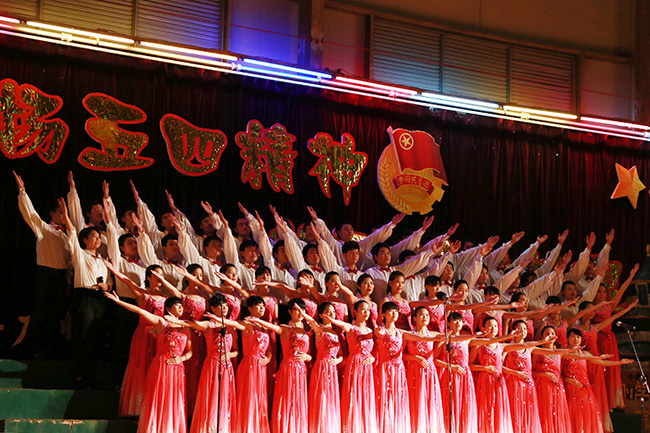 2014年04月29日晚19:30,广东技术师范学院天河学院“弘扬五四精神,放飞时代梦想”五四表彰暨大合唱比赛在体育馆隆重举行。学院领导以及八个教学系部共同欣赏了一场红色盛典。 大会对这一年来的团工作进行了总结表彰,学院领导为获得优秀团员、优秀团干、优秀团支部的代表进行颁奖后,一曲曲“红旗飘飘”在校园里激情回荡。激动人心的时刻紧紧相扣在第七个节目,计算机科学与技术系的队伍隆重登场。一位位穿着玫红色长裙的女生以端庄优雅的步姿徐徐入场,身穿金黄色礼服的女指挥员优雅地走向指挥台,弯曲她的纤腰,向学院领导以及八个教学系部表示她的敬意;挥动她的指挥棒,向队伍宣告合唱的开始。