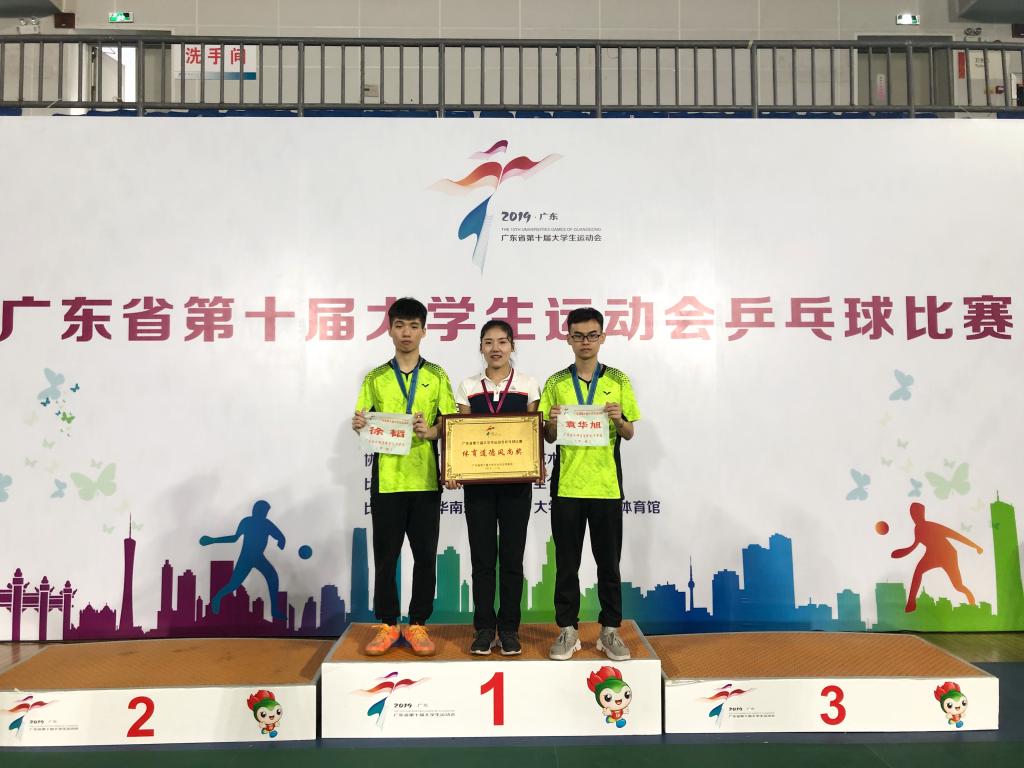 成绩来之不易。在第一阶段小组循环赛中,公司男子双打队员徐韬和袁华旭同学先后战胜广州大学、南方学院、广外、东莞理工学院的强劲对手,以小组第一出线。接下来16进8的比赛中对阵广东药科大学,以2:1胜出,挺进8强。在4强赛中对阵广东海洋大学,在对手领先1局的不利形势下,两名运动员顽强拼搏,最终以3:1战胜对手,挺进4强。季军争夺者是本次比赛东道主华南理工大学选手,虽然现场华工的啦啦队声势浩大,但我们最终以3:2战胜对手,获得本次大运会乒乓球甲组男双比赛的季军。