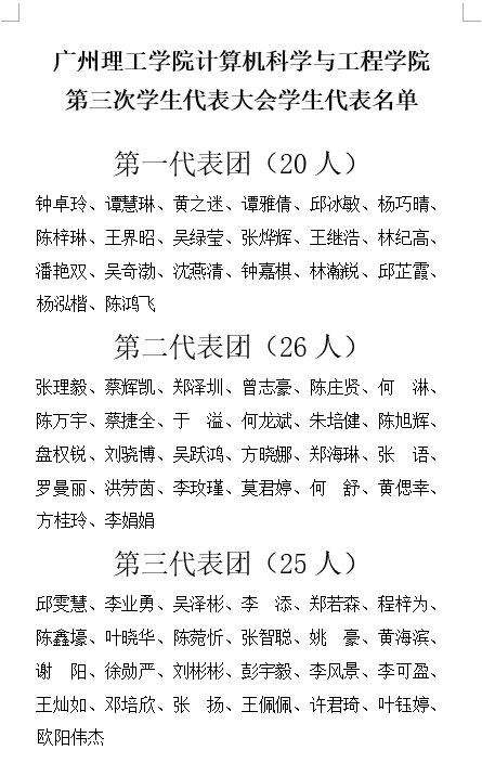 根据公平、公开、公正原则,经各班评选,学院审核,对大会正式代表名单更新增加,进一步拟订公司第三次员工代表大会员工代表,根据事实情况增加代表40人,更新如下: