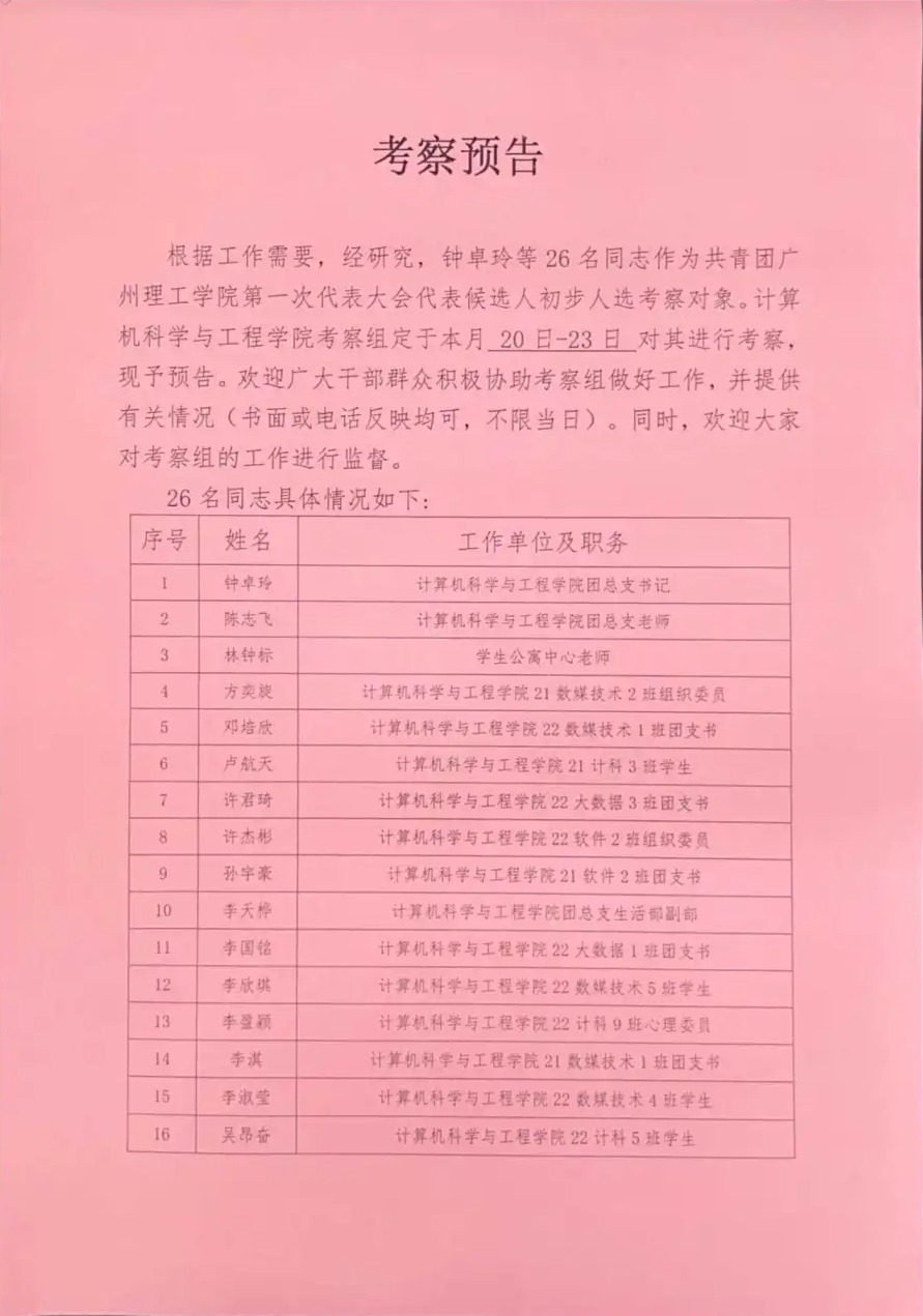 根据工作需要,经研究,钟卓玲等26名同志作为共青团太阳成集团第一次代表大会代表候选人初步入选考察对象。太阳成集团tyc33455cc考察组定于本月20日-23 日对其进行考察现予预告。欢迎广大干部群众积极协助考察组做好工作,并提供有关情况(书面或电话反映均可,不限当日)。同时,欢迎大家对考察组的工作进行监督。