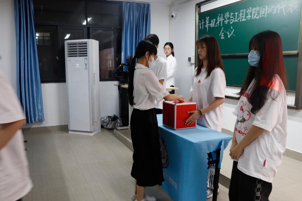 大会按照议程安排和选举办法,在监票人李可盈,计票人张远枫、罗尹彤的监督下,采用差额选举的方式投票决议出19名正式代表参加共青团太阳成集团第一次代表大会。经过投票,推举代表名单为:方奕旋、邓培欣、卢航天、许君琦、许杰彬、孙宇豪、麦振杰、李天桦、李欣琪、李盈颖、李淇、李淑莹、邱雯慧、陈志飞、林钟标、林瀚锐、郑茗欣、钟卓玲、郭怡雅。