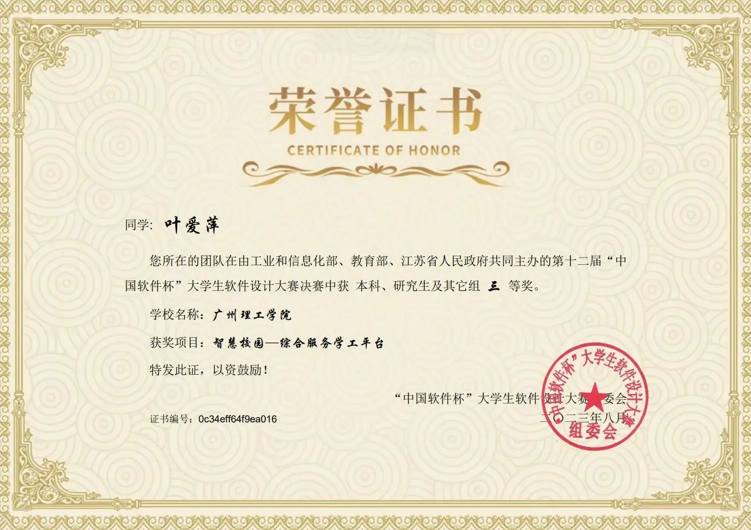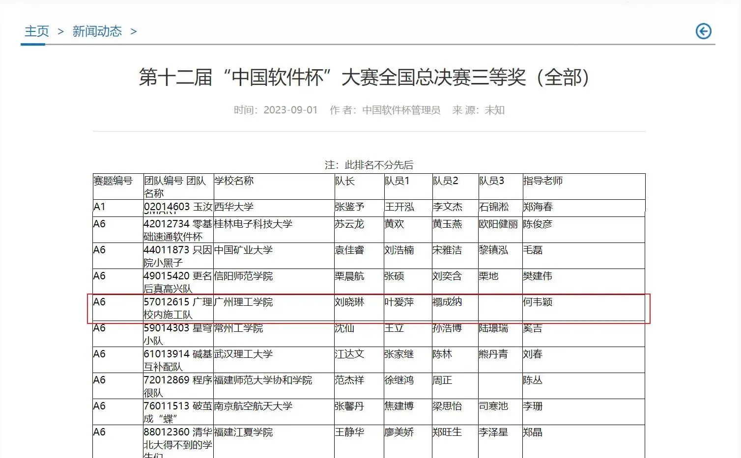 (通讯员:李风景 禤成纳)近日,第十二届“中国软件杯”大赛全国总决赛获奖名单终于揭晓,太阳成集团tyc33455cc天软科技工作室何韦颖和周文剑老师指导的,由20级计科专业的刘晓琳、叶爱萍、禤成纳三位同学组成的“广理校内施工队”获得了A类赛事国家级三等奖!