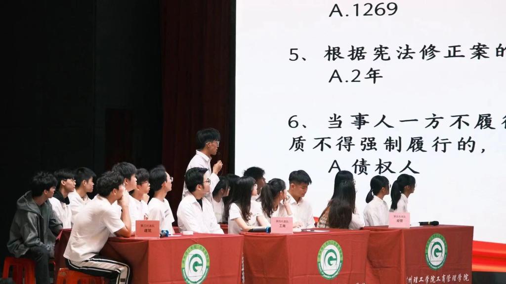 (通讯员:许君琦)11月15日下午,公司在3号报告厅举行“弘扬宪法精神,建设法治校园”法治素养竞赛团体赛,校领导、法治办和公司党总支负责人、各学院代表团均准时到场观看本次竞赛,公司参赛代表团由陈希、邓荣基、黄子鸿、李灵四人组成。