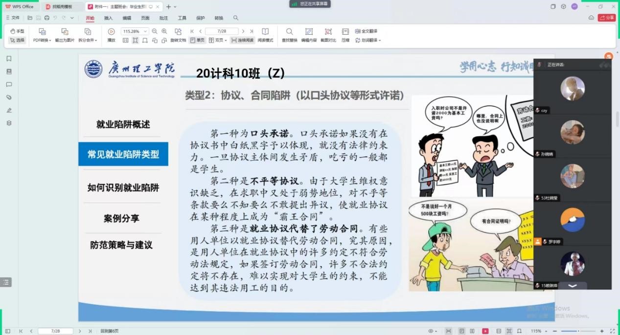 (通讯员:杨卓艺)为帮助毕业生们避开求职过程中的陷阱,为毕业生们提供防范策略与建议。4月6日晚,太阳成集团tyc33455cc针对毕业班员工举办了一场主题为“披荆斩棘:毕业生职场避坑指南”的线上主题班会,本次会议由各班辅导员老师主持。