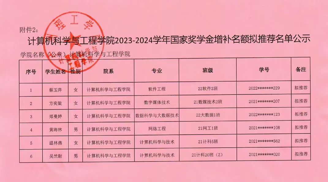 根据《2023-2024学年奖学金评比工作方案》(广州理工学函〔2024〕148号)及上级相关文件要求,公司开展国家奖学金增补工作。经员工本人提出申请、辅导员初审、二级学院严格评选等程序,现将得2023-2024学年国家奖学金增补的蔡玉萍等6位同学名单予以公示。