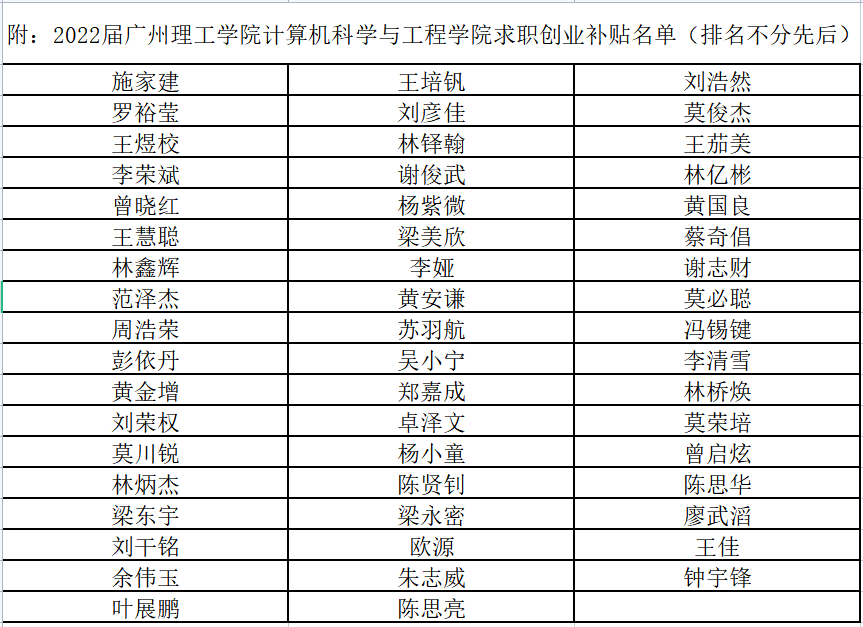 根据中国南方人才市场管理委员会办公室《关于印发在穗院校2022年毕业生求职创业补贴申领指南的通知》,经过学院审核,公司求职创业名单已产生,共有施家建等53名同学。现面向全校公示2022届毕业生求职创业补贴名单,并就相关事宜通知如下: