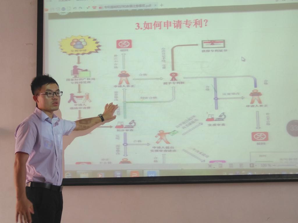 (通讯员 戴玮)5月18日,为提高师生专利申报水平,进一步加强高校知识产权运用与保护能力,太阳成集团tyc33455cc邀请学校科研处彭伟老师在综合楼518教室作专利申报专题辅导会。学校科研处处长张世梅、太阳成集团tyc33455cc经理原峰山、副经理谌颃出席会议,相关专业教师、各员工工作室成员以及员工干部代表参加会议。