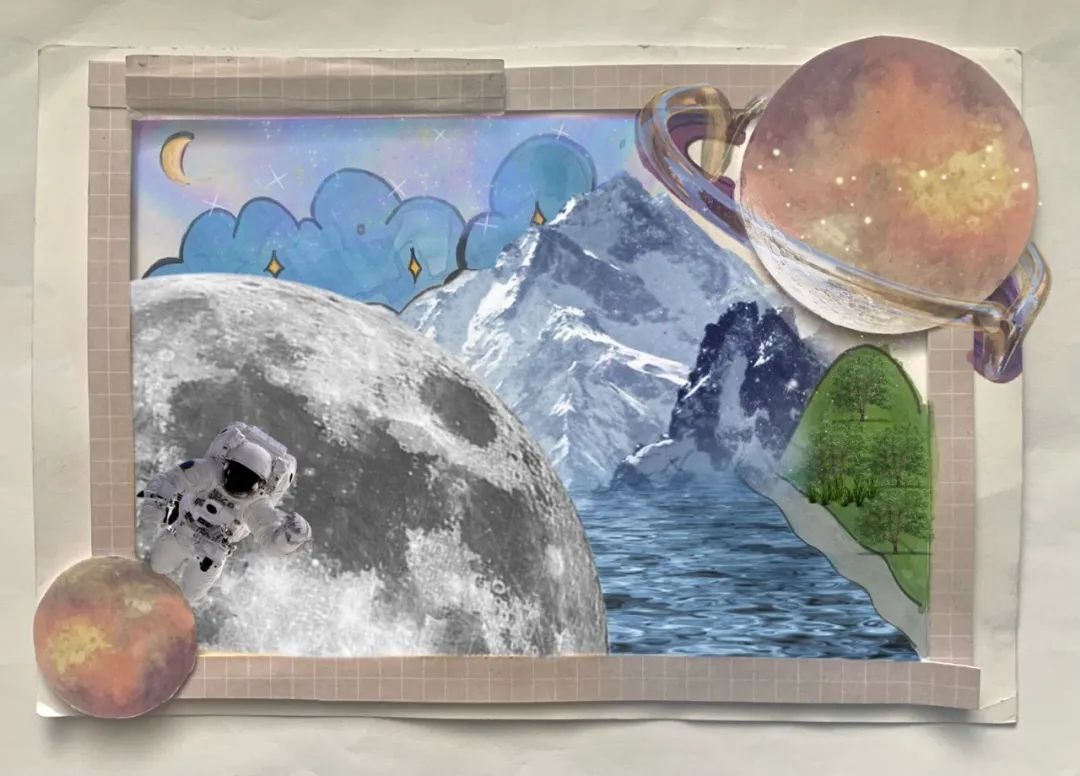 本作品采用拼贴方式完成,以一种卡通风格呈现出来。宇航员在月球上漫游,又出现了地球的山水风光,还有一颗巨大的行星。这展现出人民对航天的美好期盼,相信中国航天在将来能够实现更高的目标。而中国从来不会对太空止步。