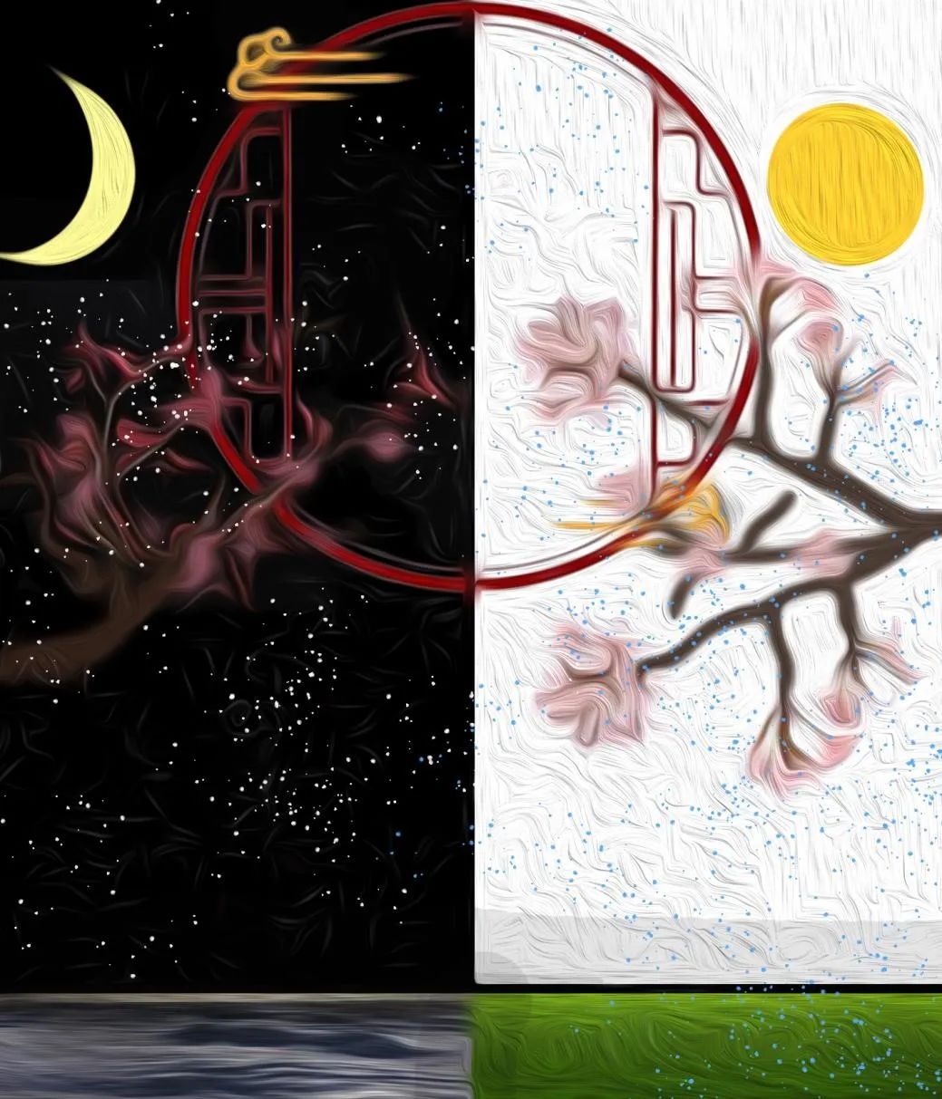 这幅作品的左右两边形成鲜明对比,右半边的背景为一个下雨的夏天,夏季的雨滴给樱花和草地带来生机,而雨水,在夏季的白天更加明显,若是晚上,雨水则不那么明显。与之相比的是左半边的下雪的夜晚,雪花在夜晚更加“冻人”,而雪地比较昏暗,也表现了冬季天气寒冷,植物比较难生存。而梅花是为数不多在冬季开放的植物。左右两边的梅花与樱花颜色接近,但比起樱花的稚嫩,梅花显得更加高雅。