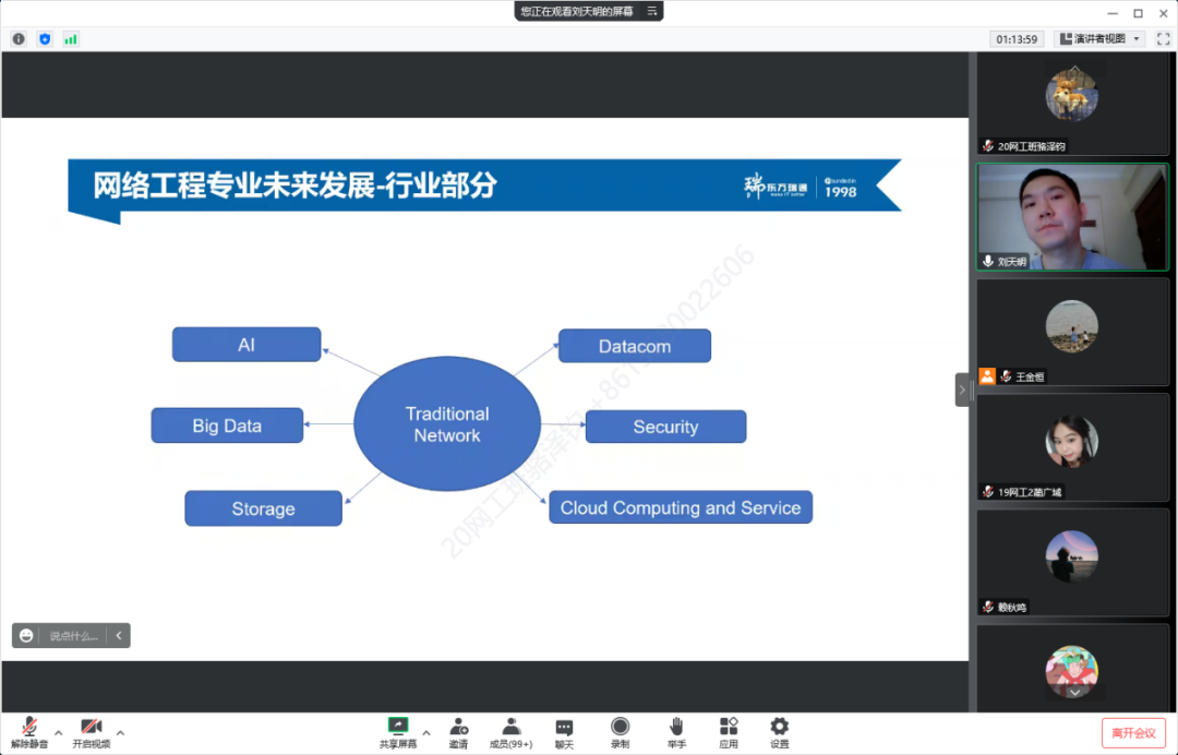 (通讯员:王金恒)11月10日下午,太阳成集团tyc33455cc三全育人素质教育周专业教育类网络工程专业主题讲座通过线上的方式顺利开展,讲座由东方瑞通华为IE讲师刘天明老师主讲,网络工程系王金恒老师主持,网络工程专业全体同学在腾讯会议认真听取了本次讲座。