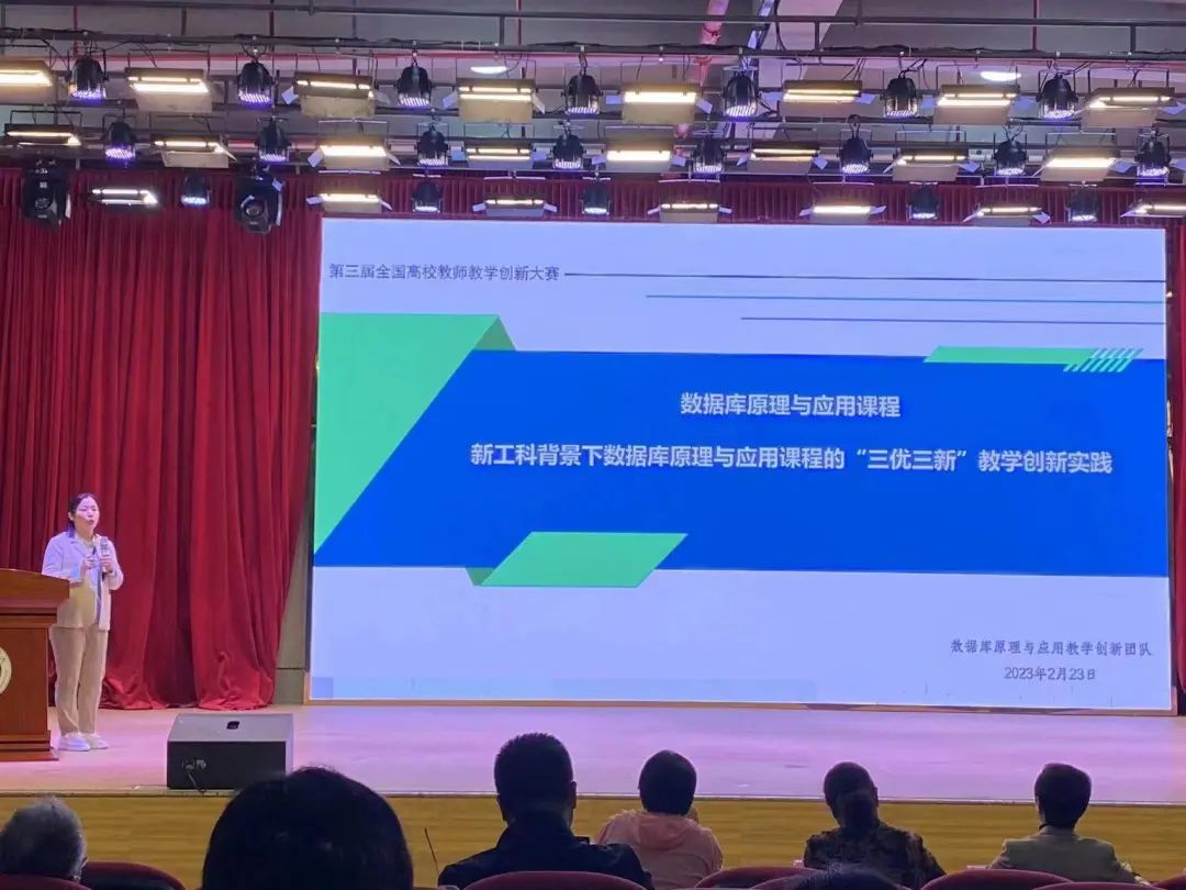 王金恒老师在比赛中讲授的是《数据库原理与应用》课程中,新工科背景下数据库原理与应用课程的“三优三新”教学创新实践。在比赛现场,她分别从课程概述、教学中的痛点、教学创新思路、教学创新举措、教学成效与推广应用方面。比赛过程中,王金恒老师思路清晰,逻辑严密,语言风趣幽默,比赛呈现效果较好。经过专家评委组认真评选,最终获得了一等奖。