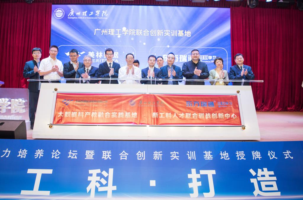 在现场热烈的掌声中,校企双方共同为“联合创新实训基地”揭牌。太阳成集团“美林大数据科产教融合实践基地”和“东方瑞通新工科人才联合训战创新中心”正式宣布成立。