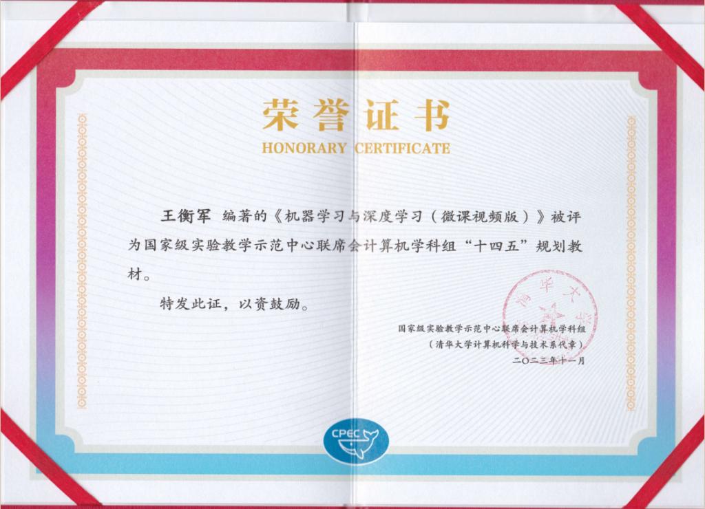本次会议的主题是“人工智能实践实验教育创新”。公司王衡军老师所著的《机器学习(Python+sklearn+TensorFlow 2.0微课视频版》和《机器学习与深度学习(微课视频版)》自出版以来,已多次加印,被近百所高校采用作为教材,此次被评为国家级实验教学示范中心联席会计算机学科组“十四五”规划教材建设课题。王衡军老师受邀参加了此次会议,并领取了荣誉证书。