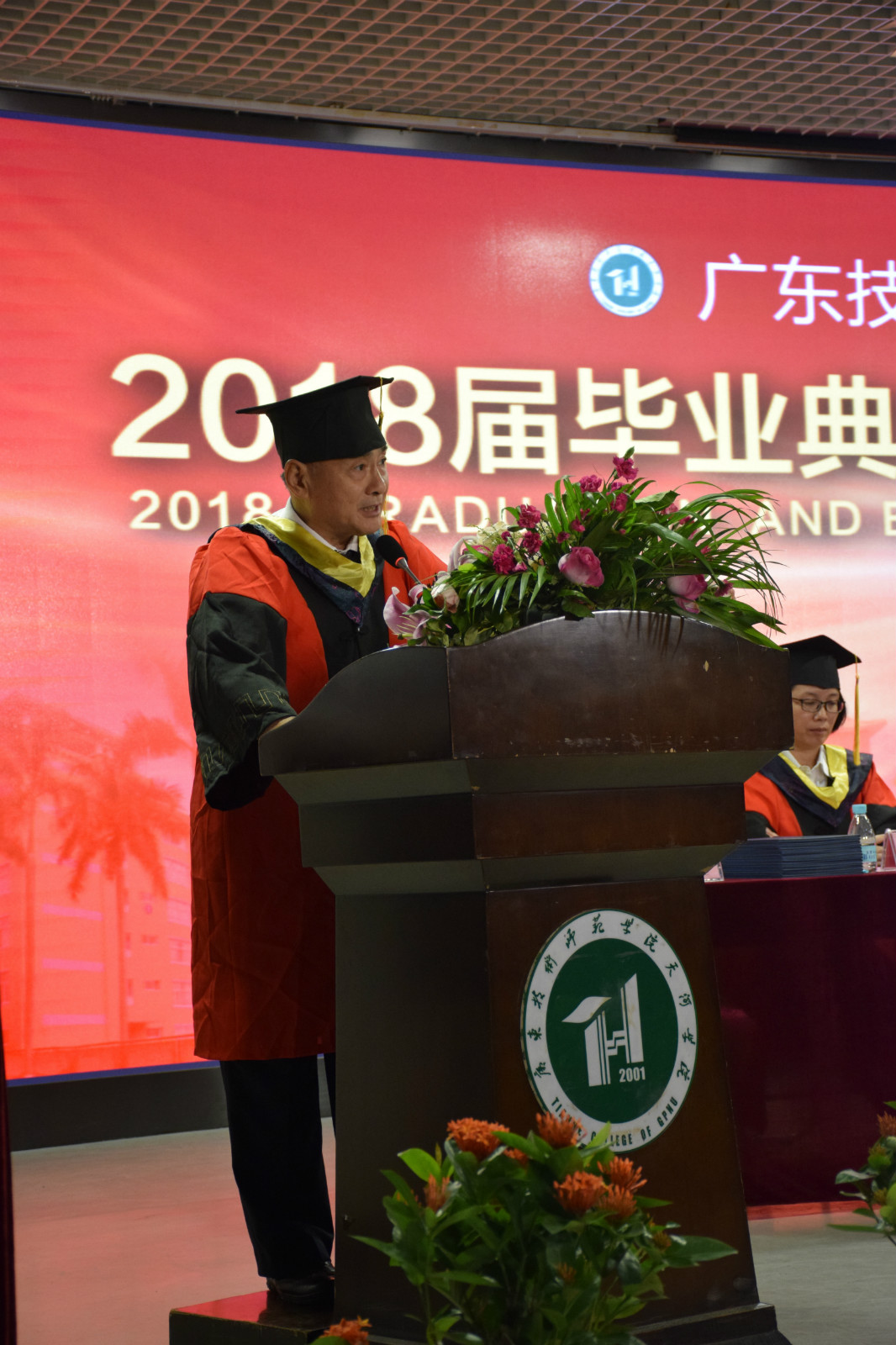 伴随着庄严的歌声和耀眼的聚焦灯光,太阳成集团tyc33455cc经理原峰山高举着学术权杖,带领院学位评定委员会全体委员和2018届全体毕业生缓缓进场,全场起立,注视着权杖前进,行注目礼。入场完毕后,主持人宣布毕业典礼正式开始,全体起立,奏国歌。然后,现场毕业生代表为教师代表、家长代表献花。