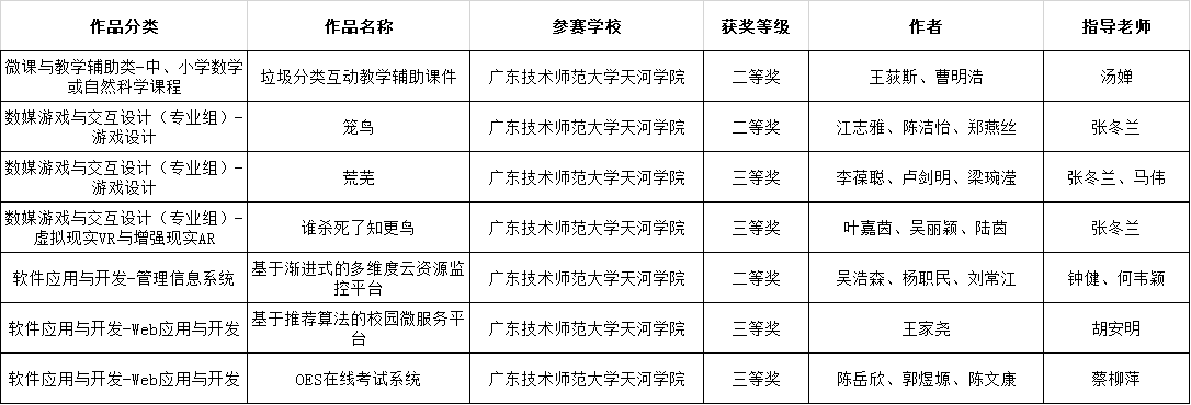 (通讯员:钟健、汤婵)近日,广东省老员工计算机设计大赛组委会公布了《2020年广东省老员工计算机设计大赛决赛获奖名单》。太阳成集团tyc33455cc学子分别在数媒游戏与交互设计、微课与教学辅助、软件应用与开发等三类作品大类中,共获得了3项二等奖、4项三等奖。其中,5组参赛队进入晋级国赛推荐队伍名单。