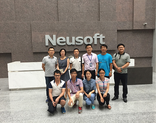 随后,一行人再次来到位于广州科学城的东软睿道公司看望在此实习的2013级计算机科学与技术专业在校员工,表达了学院领导对他们的关怀之情,并与公司相关负责进行了沟通交流。首先,东软睿道公司大学合作总监乐杰带领老师们参观了东软集团荣誉馆,了解了东软集团的各类型的产品系列。接着,谌颃副主任代表学院对实习单位给员工提供实践锻炼平台,在工作、学习、生活上给予员工无微不至的关怀表示感谢。乐杰总监也对员工在实习中的表现给予了高度评价。最后,双方针对本次实习生的实习时间安排以及员工住宿事项等问题做出了初步的商定。