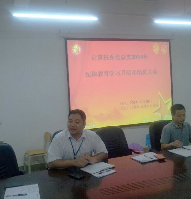我系于2014年9月18日下午在计算机系会议室召开计算机系党总支2014年纪律学习月活动动员大会。出席本次会议的有计算机系党总支书记彭康煜、计算机系主任申青连、系办主任袁桢强及团总支书记何祉谕和全体教工党员。大会由计算机系党总支书记彭康煜主持。