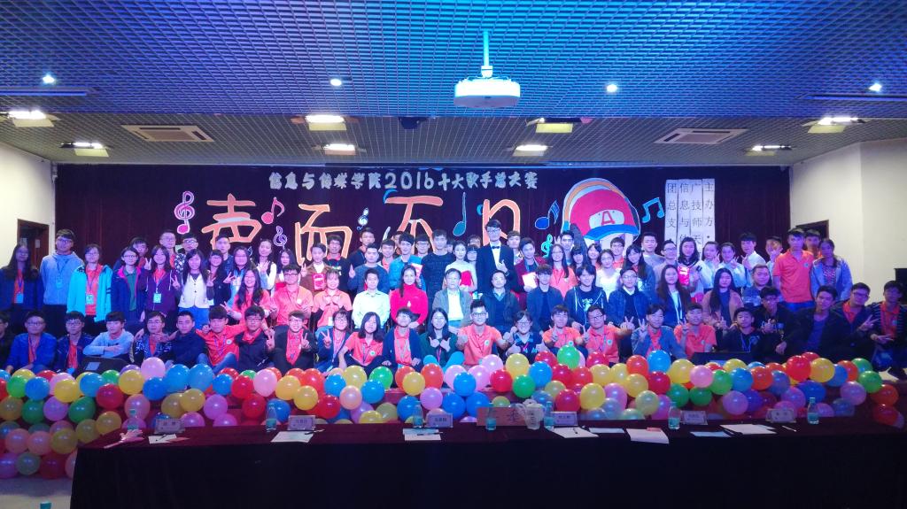 12月2日,信息与传媒学院“声而不凡”十大歌手决赛在学术报告大厅隆重举行。本次决赛的评委有2013年校园十大歌手总冠军张嘉桐师姐、2013年校园十大歌手郑文辉师兄、2014年校园十大歌手刘桂妃师姐、2014年艺术学院十大歌手林拓师兄、2014年管理学院十大歌手石育臣师兄、2015年校园十大歌手赵鹏师兄等。并邀请信息与传媒公司党总支袁颂皎书记、谌颃副经理、团总支杨柳书记以及辅导员黄鸿鑫老师作为本次大赛的嘉宾。