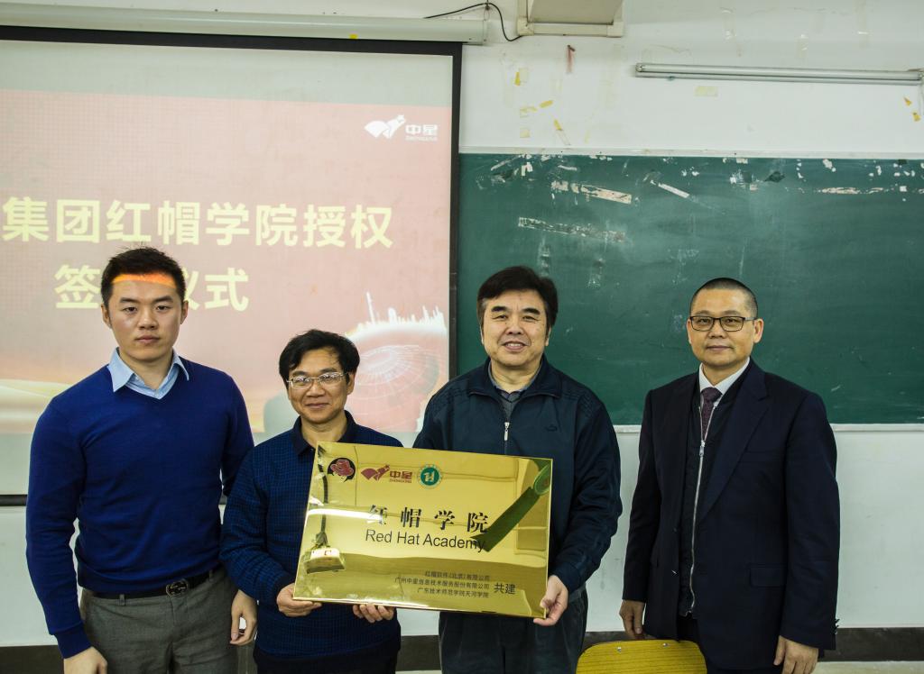 3月17日,公司举行与中星集团共建红帽学院签约授牌仪式。广州中星集团有限公司董事长王碧武、广州中星信息技术服务股份有限公司副总裁李伟阶、红帽软件(北京)公司运营总监李波,公司副董事长蔡敏、教务处处长蔡朝晖,信息与传媒学院副经理申青连和谌颃、党总支书记袁颂皎,网络与教育技术中心主任田桂丰参加了仪式。