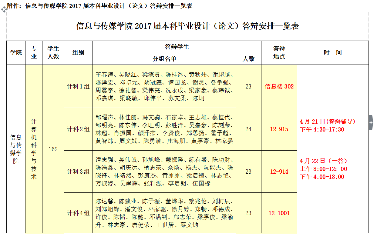 附件:信息与传媒学院2017届本科毕业设计(论文)答辩安排一览表