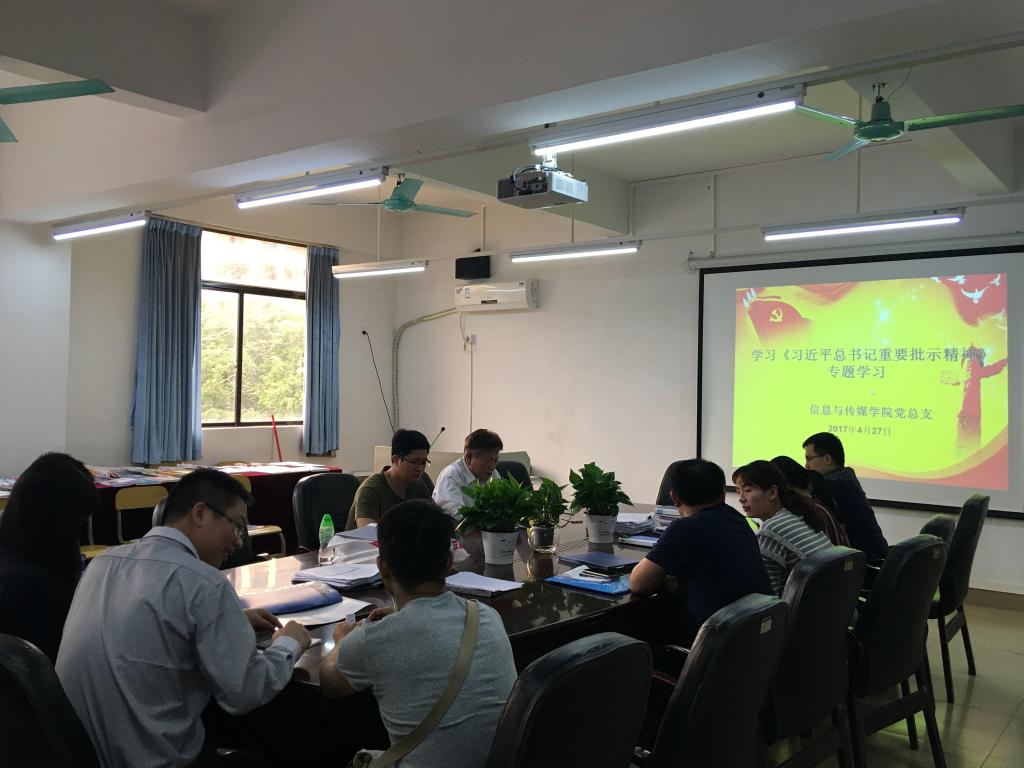 2017年4月27日下午3点,信息与传媒学院教工党支部在11#302教师会议室召开全体党员同志学习《习近平总书记重要批示精神》,参加本次会议的有党总支书记袁颂皎以及全体教工党员。通过学习,使全体党员更加深刻地理解了“四个坚持、三个支撑、两个走在前列”的重要精神。即坚持党的领导、坚持中国特色社会主义、坚持新发展理念、坚持改革开放,为全国推进供给侧结构性改革、实施创新驱动发展战略、构建开放型经济新体制提供支撑,努力在全面建成小康社会、加快建设社会主义现代化新征程上走在前列。