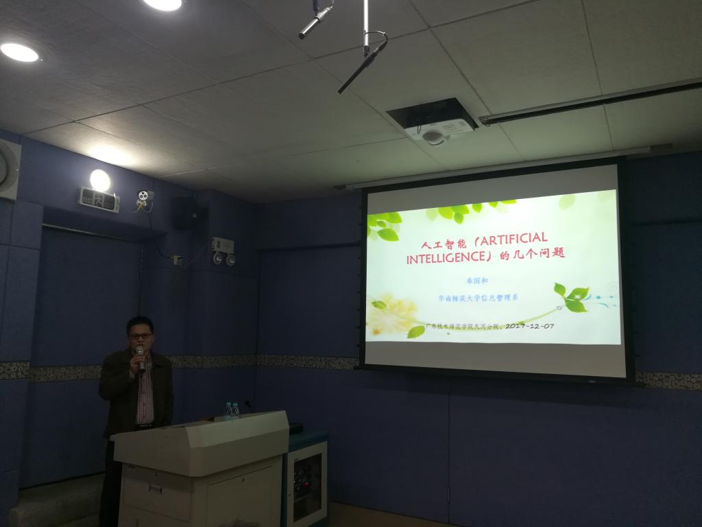 本次讲座的主讲人为华南师范大学信息管理系奉国和教授。奉教授用形象生动的语言,内容丰富的PPT,从生活中人工智能、人工智能定义、人工智能核心技术、人工智能应用与发展、人工智能VS人类智能,这几个方面为我们介绍了人工智能的几个问题。