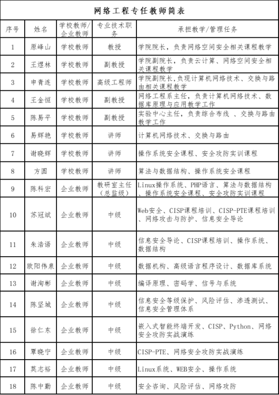 现有教师18人,其中有10人为蓝盾信息安全股份有限公司的技术总监或工程师,拥有高级职称的有4人,博士1人,85%的教师具有硕士学位。