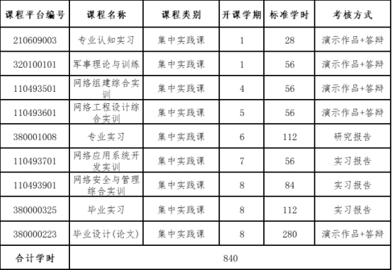 在集中实践环节中,把网络工程专业的四个能力都设计有一个综合的实训,最后,毕业设计是对这四个能力的一个综合实践训练。